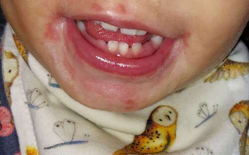 Hier dachten wij in 1e instantie zelf ook aan. Komt weer een tandje door dus er wordt heeeel flink gekwijld en ze is ziek geweest dus veel haar speentje gehad terwijl ze die normaal alleen in bed heeft