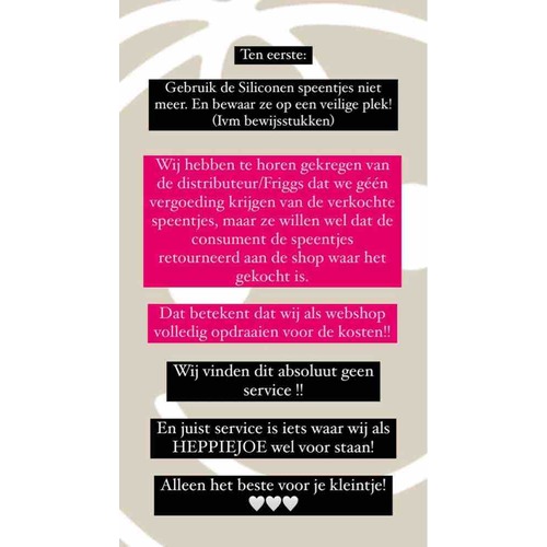 Een veiligheidsprobleem dat de tepel loslaat van het speenschild. Wel enkel de silicone frigg fopspenen, dus de latex heeft dat probleem niet. Moet eens kijken op hun instagram pagina daar staat de hele uitleg op. Wss ook op hun site.