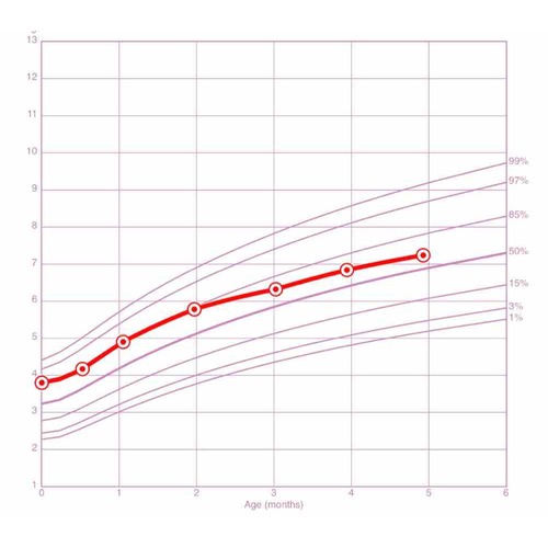 bij borstgevoede kindjes is het ook volkomen normaal dat ze eerst een sterke groei laten zien en dat dan de curve een beetje gaat afvlakken.
