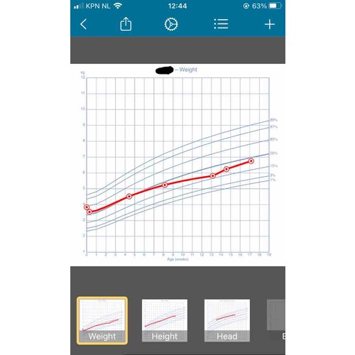 Mijn zoontje had ook zo’n soort curve (zie foto). Consultatiebureau vond het wel prima, maar ik maakte me zelf ook wat zorgen. Ik ben hem vaker gaan aanleggen, ook als hij nog niet perse honger lijkt te hebben en nu groeit hij weer heel goed. Eerder gaf ik hem vaak ‘s nachts eerst een speen als hij wakker werd, dan liep hij wel weer een poosje verder, maar nu ga ik hem dan toch maar weer voeden.
