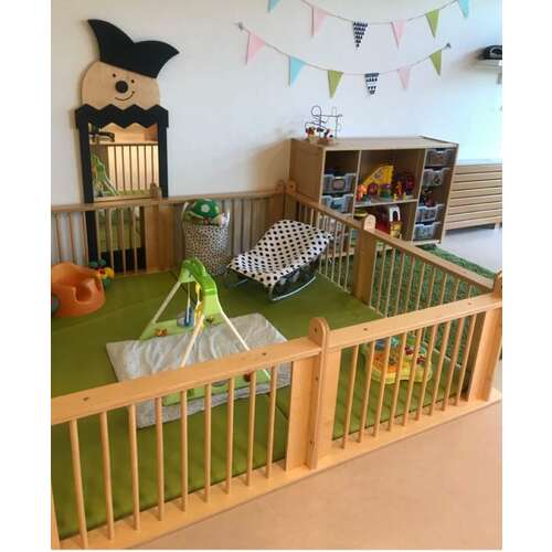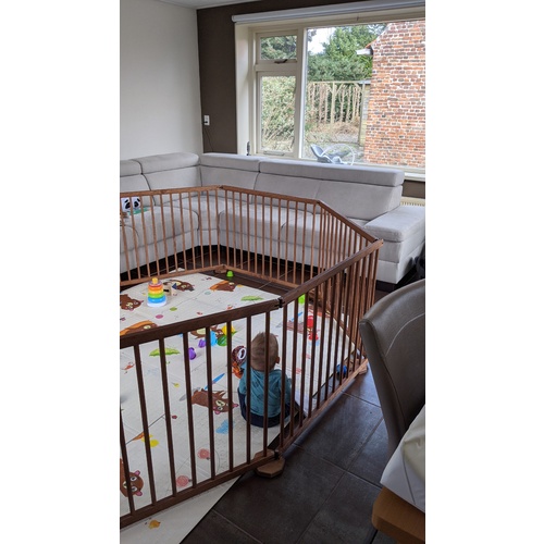 Wij hadden een speelmat en daarrond een hek om een grondbox te creëren. We hebben het hek aangeschaft toen hij 8 maanden was ongeveer. Toen begon hij echt beweeglijk te worden qua kruipen. Nu is hij 22 maanden en ik gebruik het 's ochtends als ik alleen ben, terwijl ik me douche. Dan is dat z'n plek om even alleen te spelen. Voor de rest van de dag gaat het nu opzij, maar voor hij echt goed rondliep, bleef het hek staan.
