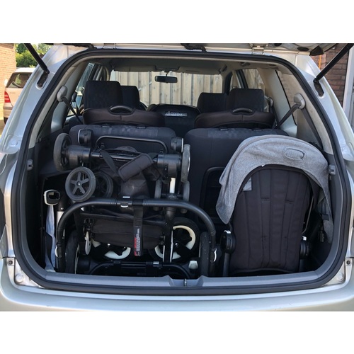 Wij hebben een Peugeot 5008. Daar past achterin onze kinderwagen en buggy en wip stoeltje. Wij hebben ook dan 5 stoelen.