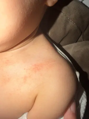 Andere kant van zijn schoudertje als in zijn andere schouder of de achterkant? Als het beide schouders zijn, zou het dan niet van de riempjes van een autostoeltje/maxi cosi oid kunnen zijn? Lijkt een beetje op die hoogte te zitten