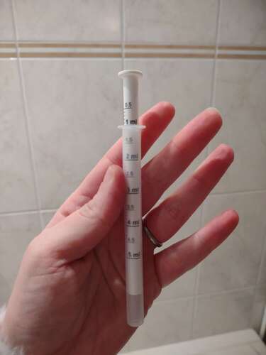 Maar de vloeistof optrekken met deze spuit tot de streep van 1 milliliter gelijk staat met de rand van de spuit. (Vermoed dat dit ook op jouw foto te zien is)