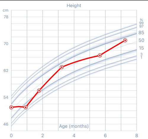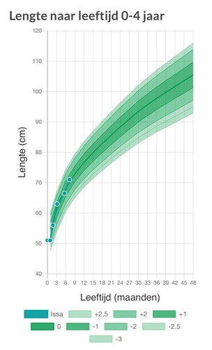 Naar mijn weten is een lengte van boven de 70 cm en een gewicht van ongeveer 9 kilo helemaal niet verkeerd voor een kindje van 7 maanden... Ik snap niet zo goed waar ze dit op baseren eerlijk gezegd.
