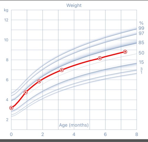 Welke curve is dit? Het CB werkt met een tno curve, maar die kijkt naar de groei van borstvoedingskindjes en kv kindjes. En kindjes die kv krikgen, die groeien anders. Vul het eens in op ren who curve. Kan me zomaar voorstellen dat het dan echt exact de lijn volgt.