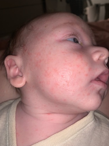 Ons dochtertje had echt precies hetzelfde! Heel heftig en over haar hele gezicht, borst en bovenkant van haar rug. We zijn ermee naar het cb en de huisarts geweest en beiden zeiden dat het baby-acne was. Het heeft een week of drie/vier geduurd en daarna verdween het vanzelf, hebben we verder niets aan gedaan.
