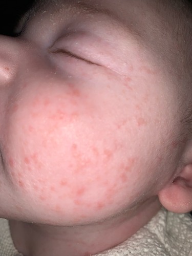 Ik denk dat dit gewoon babyacne is en zou vooral niets er mee doen. Niks erop smeren en gewoon laten gaat vanzelf over.