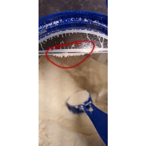 Dat heb ik ook wel eens met de comfort de ene keer zijn de blikken heel fijn poeder en dan de andere keer is het wat grovere poeder ik dacht wat apart maar ze heeft er verder geen last van ofzo