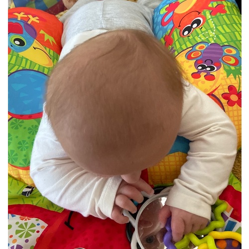 Hier ook een afplatting van 110%. Na een maandje heel veel er mee bezig te zijn geweest, merk ik nu dat de afplatting iets minder begint te worden en het wat ronder is. Dit vooral door overdag ervoor te zorgen dat hij absoluut niet op zijn voorkeurshouding ligt. Hij slaapt overdag altijd in het zijligkussen of voedingskussen met hoes (onder toezicht). Binnenkort krijgen we nog een nieuwe meting. De voorkeurskant is helaas nog wel lastig om eruit te halen.