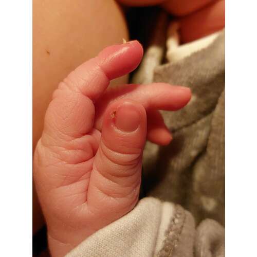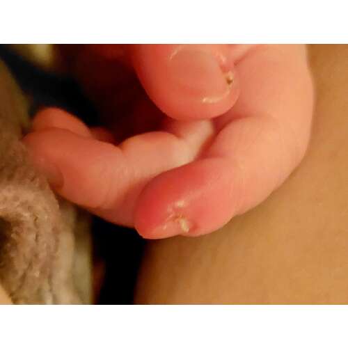 Ik zou haar handjes goed schoon houden en voorlopig even niet aan de nageltjes komen.