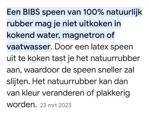 Natuurrubber breekt af boven de 100 graden, vandaar. Silicone is wel bestand tegen hogere temperaturen. Dus check van te voren het materiaal van de speen 😊 Je kan ze dus bijvoorbeeld in gekookt water leggen (dus van het vuur af zeg maar)
