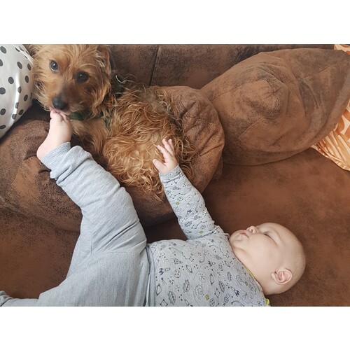 Ze is rustig zodra wij onze zoon vast hebben, besnuffeld hem graag en checkt ook regelmatig bij de box. Ik moet wel eerlijk bekennen dat zodra ze met een van ons buiten loopt, ze daar graag een speelkwartier van maakt, wat prima is. Ze is nog maar een jong dier. Vaak moet ook de kat het ontgelden. Maar naar onze zoon toe is ze super lief.