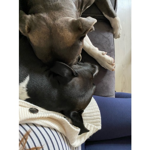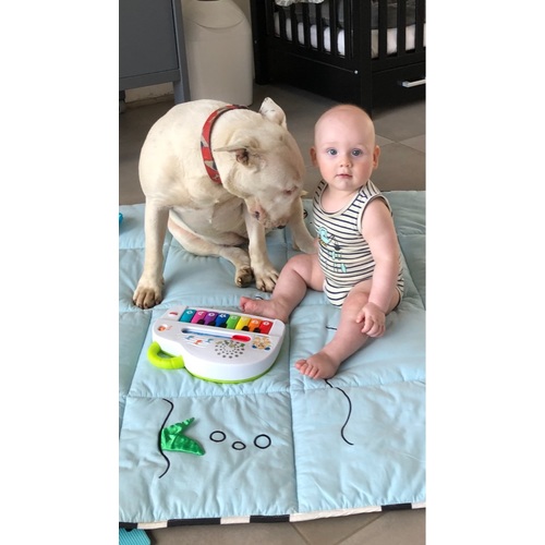 Wij hebben ook een bull terriër. Tijdens mijn zwangerschap wist ze soms niet goed hoe ze zich moest gedragen is wel pas 2 jaar geworden in juni. Maar dan nog. Toen mijn zoon geboren was heel veel laten wennen aan elkaar en zoals je op de foto ziet ze zijn onafscheidelijk. 4pootjes2handjesop1buik🥰🥰