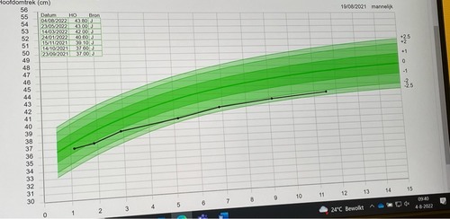 Wij zijn 6 maart voor het laatst geweest. Mijn zoon is geboren met 2730 gram. 6 maart was hij net 7 maanden en 67 cm, 7915 gram en het hoofdje 40,6. Hij ons is het hoofdje ook te klein, zit zelfs onder de curve. Mijn zoon is door de mri geweest, gelukkig niks aan de hand. Hij ontwikkeld zich verder prima, misschien iets langzamer maar ieder kind is verschillend.