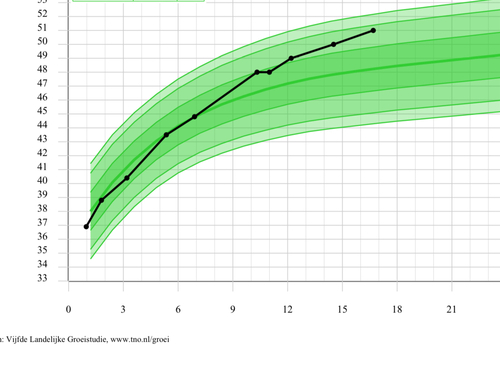 Lengte is -1 en gewicht zit nu iets boven de 0 lijn. Qua gewicht is hij wel gestegen (begonnen op p19 met geboorte, maar zwangerschapsvergiftiging en iets eerder geboren) en omdat het een goede eter is maar laat was met bewegen zijn de spekjes nog niet weg. Maar het loopt niet in lijn met zijn hoofd.