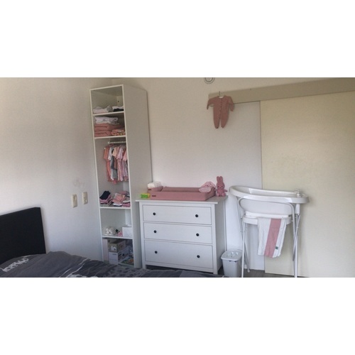 Wij hebben dit gecreëerd op onze slaapkamer. Wij hebben wel een grote slaapkamer, jullie niet zo te lezen. Weet niet wat voor kledingkast jullie hebben, maar wij zweren bij de Pax kasten van Ikea. Zijn super hoog, zelf in te delen, dus je kan er veel in kwijt. Badje gaat bij ons naar de badkamer toe, maar tijdens kraamweek moet die naast verschoonplek staan. Je kan meerdere dingen doen. Of een kledingkast voor de baby, zoiets als wij hebben en dan verschonen op bed, bank of tafel. Of een ladekast/commode. Tis maar net wat jullie praktischer vinden. Houd er wel rekening mee dat je met een kast in de hoogte werkt, dus meer kwijt kan. Daarnaast wordt de baby groter, grotere maten kleding nemen meer ruimte in beslag, net zoals speelgoed dat er gaat komen.