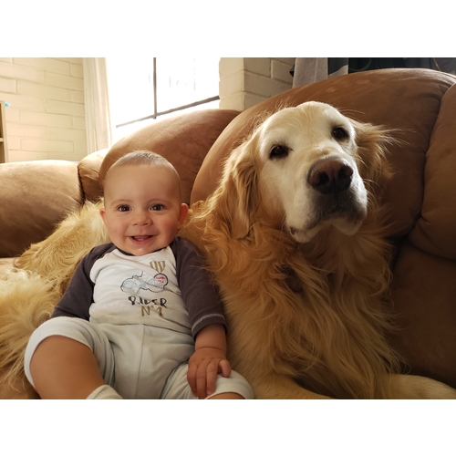 Hij is nog maar 2 maanden, met 2 maanden deed ik de hond wegduwen want die wilde dan ‘kusjes’ geven ( lebberen😂😂) mijn zoontje is 5 en een half maand ongeveer en nu zitten ze zo… ik kan het constant proberen te stoppen maar ja zolang er niet op het gezicht word gelebberd vind ik het prima…