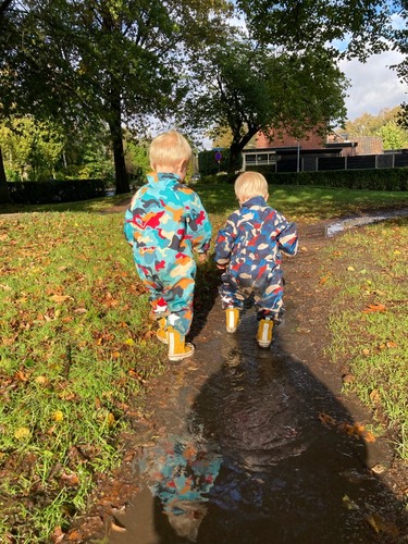 Wij zweren echt bij deze pakjes. Zodra het ook maar een beetje geregend heeft gaan ze aan. En dan kan je zelfs in een speeltuin waar de druppels nog op de speeltoestellen zitten heerlijk spelen. (Of op nat hout).