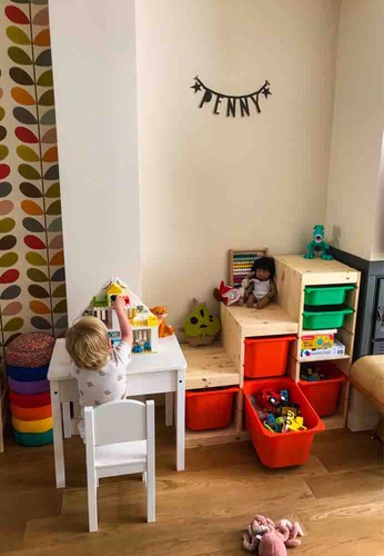 Een echte hoek gaat hier helaas niet en zijn speelgoed staat effectief in het midden van de kamer, maar ik heb bij anderen met een écht hoekje al meermaals gezien dat het alsnog overal ligt. Gelukkig is speelgoed snel opgeruimd. 😅