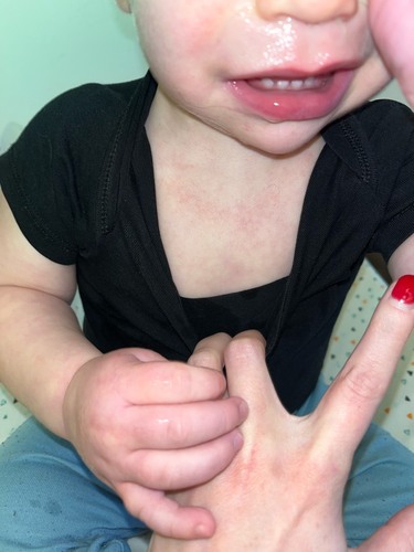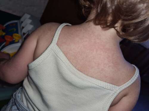 Ts Onze dochter had eerdt paar dagen echt hoge koorts (tegen 42° aan) en daarna kwamen de rode vlekjes over hele lijf. Eerst buik en daarna helemaal.