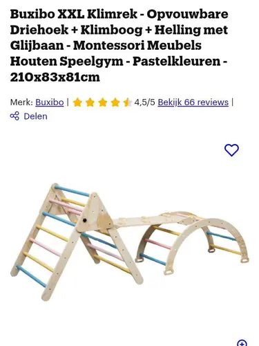 Heb precies dezelfde voor kindjes destijds 3 en 1 gekocht. Echt super leuk. Hier wordt de boog dagelijks gebruikt als ligplekje/klimding. De driehoek vind ik zelf erg eng qua hoogte en hoek die ze moeten maken dus heel lang er niet bij gehad. En als je m in zijn geheel wil hebben staan is t ook wel erg groot trouwens