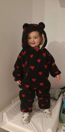 Voor een kindje van (bijna) 1 zou ik geen teddy pakje kopen, helemaal niet met vaste voetjes. Wat wel handig is is zo'n skipakje: waterdicht dus als ze buiten kruipen wordt het pakje niet gelijk vies, en zonder vaste voetjes dus de kleine kan schoentjes aan zodat ze ook een paar stapjes aan de hand mee kunnen lopen. Jasje kan ook natuurlijk, maar als het écht koud is (zoals op de fiets) is zo'n skipakje ideaal