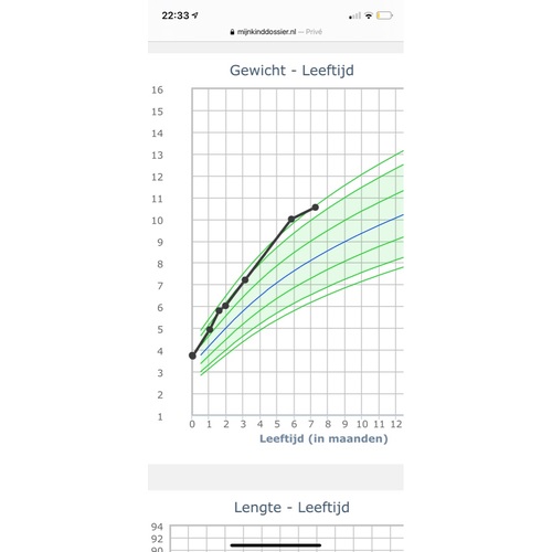Aan de curve te zien groeit hij naar mijn idee prima. Ja, hij is aan de zware kant. Maar een gemiddelde is een gemiddelde. Dat betekent dat er kindjes zijn die lichter zijn en zwaarder zijn.