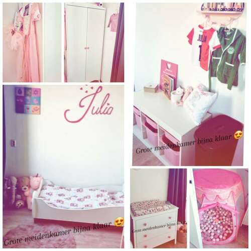 Heb foto's uit een filmpje gehaald, dus ze zijn niet zo duidelijk haha. Maar wij hebben alles neutraal gehouden en dan met roze accessoires. Zoals bijv roze knoppen op de kast en commode, roze bakken in de speelgoedkast. Zodat we het desnoods makkelijk weer kunnen veranderen. Dit was haar nieuwe kamertje toen ze 2 werd 馃榿