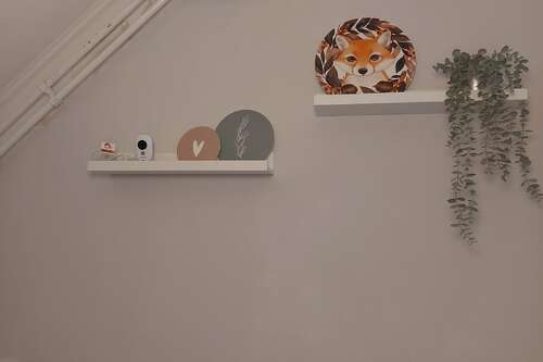 We hebben een Ikea plank voor boven de commode, de Skogsta, en opa heeft Nijntje figuren erbij gemaakt dit we eraf kunnen halen wanneer ze Nijntje zat is.