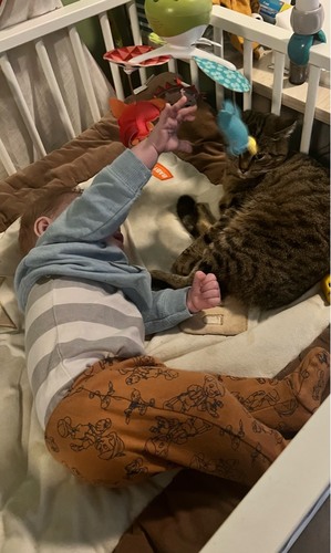 Mijn kat heeft eerder wel eens uitgehaald naar kleine kinderen. Wij waren dus ontzettend bang dat ze dit ook met onze baby zou doen. Ze vond de baby eerst absoluut niet interessant, nu snuffelt ze af en toe aan haar hoofdje. De baby is helemaal geaccepteerd en de kat gedraagt zich.