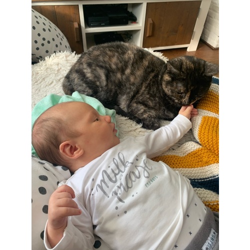 De poes die erg gehecht is aan mij heeft echt een soort moeder instinct . Zodra de kleine huilt komt ze aan rennen. Terwijl we hadden verwacht dat zij juist ver uit de buurt zal blijven van de kleine. De kater is niet bang en die kijkt af en toe maar is niet echt geïnteresseerd. We laten katten gewoon hun gang gaan en forseren niks.