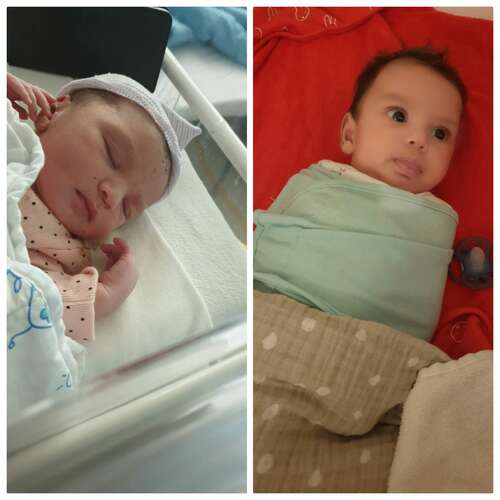 Foto 1 was hij 1 maand oud en mocht het ziekenhuis verlaten, foto 2 is 2 maanden later.