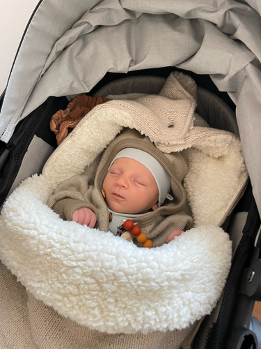 Lekker lamswolletje in de kinderwagen. Wol reguleert warmte goed.