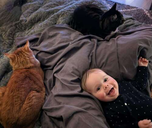 De jongste kat gaat bij hem in de buurt liggen zodat ze de kleine man in de gaten kan houden, de andere 2 katten gaan ook in de buurt liggen om alles in de gaten te houden