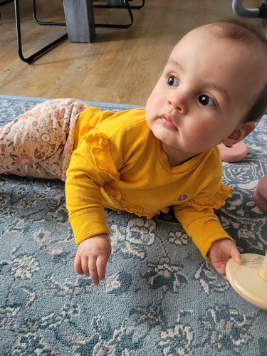 Gaat om t-shirts voor de zomer. Zit nu in 74-80 (bijna 11 mnd). Dan kan 80/86 denk ik wel!