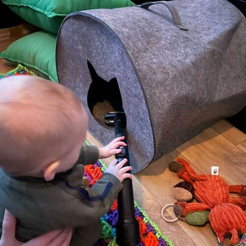 Dit 😂 Maar een aantal dingen zijn verplaatst zoals het voer, water en de kattenbak. Zodra de kleine echt goed tijgert / kruipt gaat dat waarschijnlijk allemaal naar de keuken met een hekje ertussen. Speelgoed, mandjes, krabpaal etc blijven waar ze nu liggen/staan