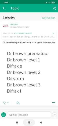 Dat klopt wel dat lijstje, de dr brown 1 ging voor onze dochter veel te langzaam en de 2 liep veel te snel. De Difrax S was toen perfect qua snelheid.