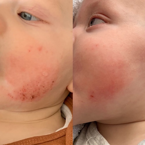 Wij ook! Onze zoon heeft het juist in zijn gezicht vooral op zijn wangen. Links was toen ik begon met smeren en rechts paar dagen later. Was het al heel snel zoveel beter. Prima dus te gebruiken voor in het gezicht 馃槉