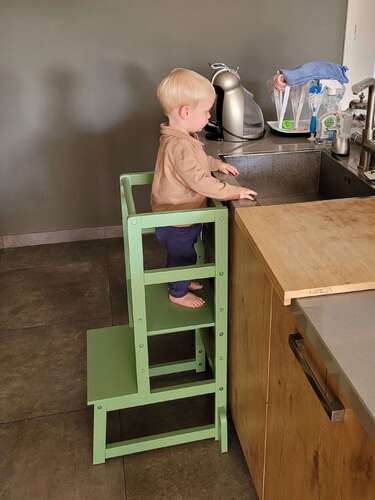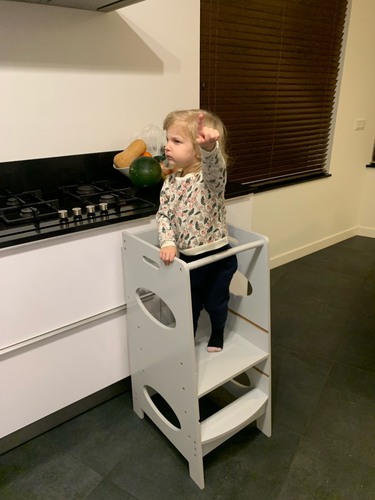 Hier voelde dochterlief zich meteen heel erg groot en dacht zo even de hond uit de keuken te kunnen sturen 🤣 maar wij vinden het ideaal! Ze wilt altijd meekijken en helpen als ik iets aan het aanrecht ga doen. Ook handen wassen gaat makkelijk zo.