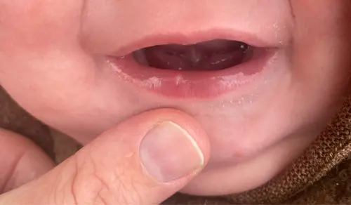 Hoi, lijkt dit op een koortslip? Er zit ook een hard stukje/ bolletje onder. Naar mijn weten is ze niet met iemand in contact geweest die een koortslip heeft/ had… Baby 6mnd.