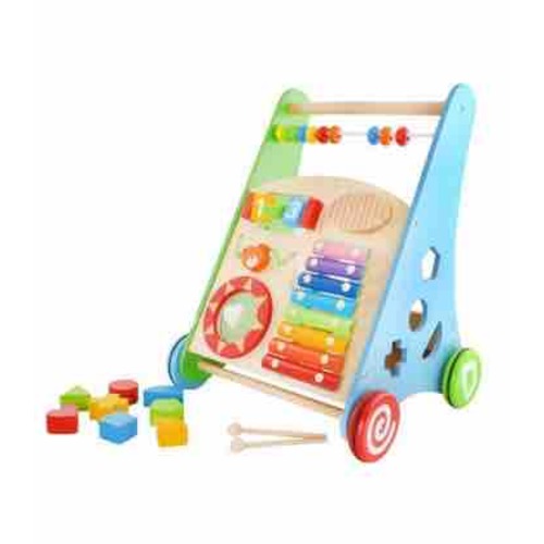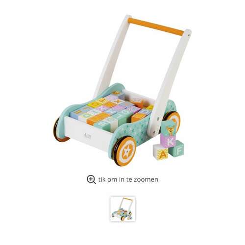 Thuis hebben we een loopwagentje van Little Dutch met houten blokken erin. Hij is nu 1,5 en het ding wordt (nog steeds) veel gebruikt. Hij blijft er het huis mee doorlopen en steeds weer andere dingetjes in het wagentje doen. Dan gaan er blokken mee, dan konijnen, auto’s, soms gaan hij er zelf in zitten.