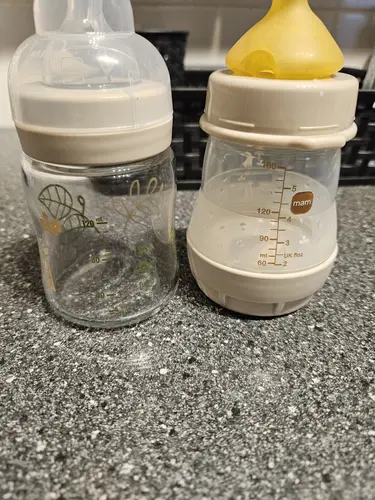 Bij de winkel Normal een (glazen) flesje van "nip" gekocht. Omdat ik de speen toch niet prettig vond en eigenlijk gister bij toeval tegen een mam fles liep in een winkel, die meegenomen (klein model 160 ml).