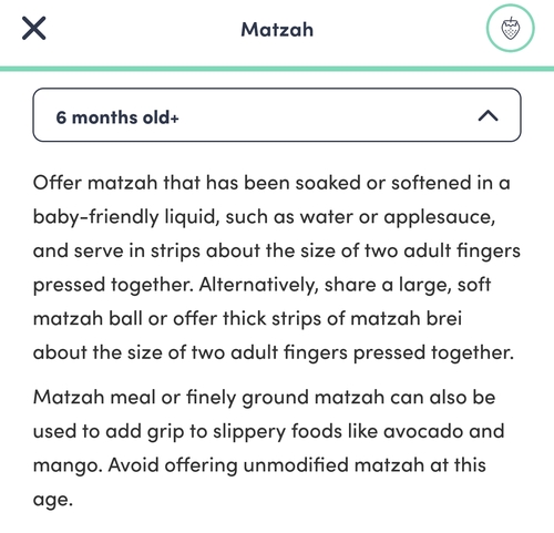 Je kan de Solid Starts app gebruiken, daar staat voor heel veel voedingssoorten in hoe je ze veilig kan introduceren. Voor Matzes staat er dat je ze kan geven als je ze een beetje zacht maakt (bijv in water weken). Je kan ze dan in reepjes van twee vingers breed geven.