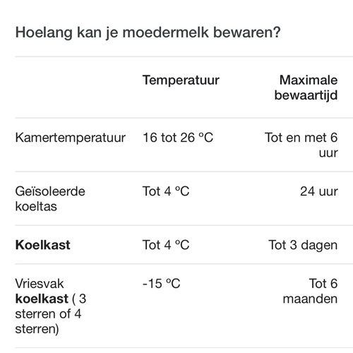 Moedermelk diepvries constant max. -18掳 C: tot 12 maanden