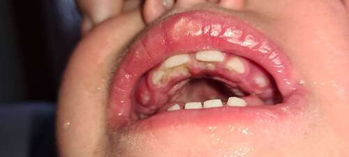 Mijn dochtertje heeft exact zulke plekken achter haar tanden. Hoge koorts, pijn en niet willen eten/drinken en extreem kwijlen Tandarts geweest die zei ernstige tandvleesontsteking.. nu moet het gereinigd worden maar krijgen er verder niks voor echt zooo zielig. Huisarts wilt er niet naar kijken omdat de tandarts nu de casus behandeld
