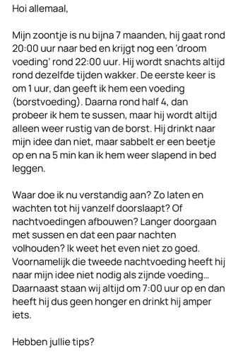 Verder zijn nachtvoedingen normaal echter als hij ochtends geen trek heeft dan zou je de nachtvoeding kunnen afbouwen. Zou gewoon steeds korter voeden totdat het enkel bij een knuffel blijft. Bij ons zoontje heb ik met 9.5 maand afgebouwd op deze manier en met 3 nachten sliep hij door