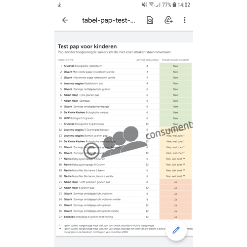 Bijgevoegd een screenshot van de test van de consumentenbond waarop je kan zien welke soorten pap van 6+ geen suikers bevatten.