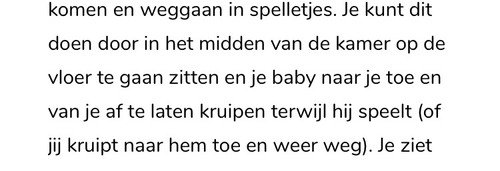 Bij bepaalde vaardigheden in apps of op websites herken ik onze zoon van 4 maand erin en bij andere vaardigheden denk ik nee, dat kan hij nog niet. Maar ik hanteer het gewoon puur als richtlijn en als interessant in de zin van: wat gaat mijn zoontje binnenkort ongeveer leren? Net als dat ik de ontwikkeling tijdens de zwangerschap bijhield uit interesse. Het is zeker niet de bedoeling dat een baby elke vaardigheid steeds keurig moet 'afvinken'. Dus echt geen reden voor stress, en het wordt hier ook al aangegeven: kruipen bij 4,5 maand zou echt heel vroeg zijn. Dus geen zorgen maken!