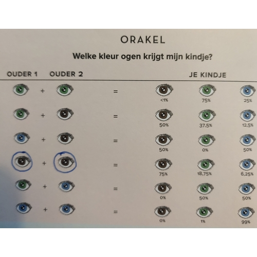 Volgens het overzichtje ben ik geadopteerd! 😂 want daar staat namelijk blauw plus bruin is 0% kans op groene ogen